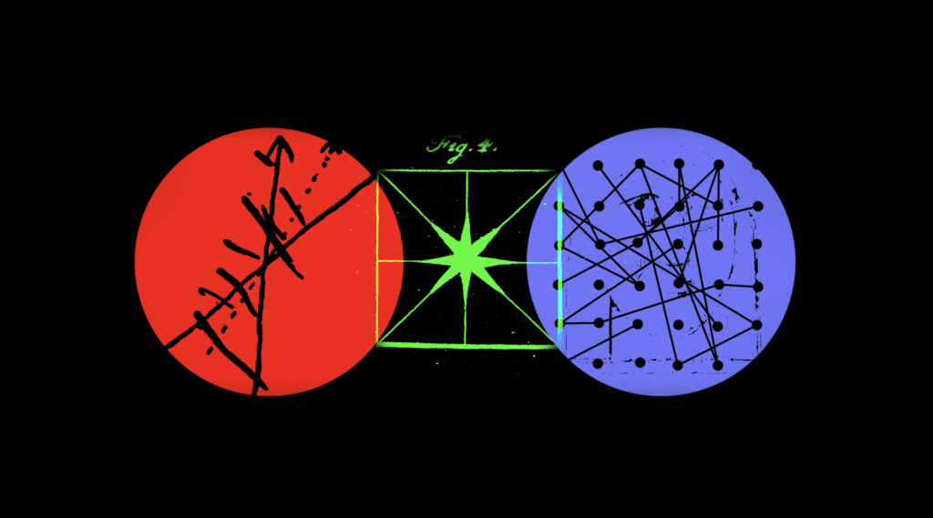H.C. Ørsteds håndskrevne beregninger (rød cirkel) og eksperimenter med klangfigurer (i grøn) toner frem i værket som puls og til påmindelse om den altafgørende gnist.