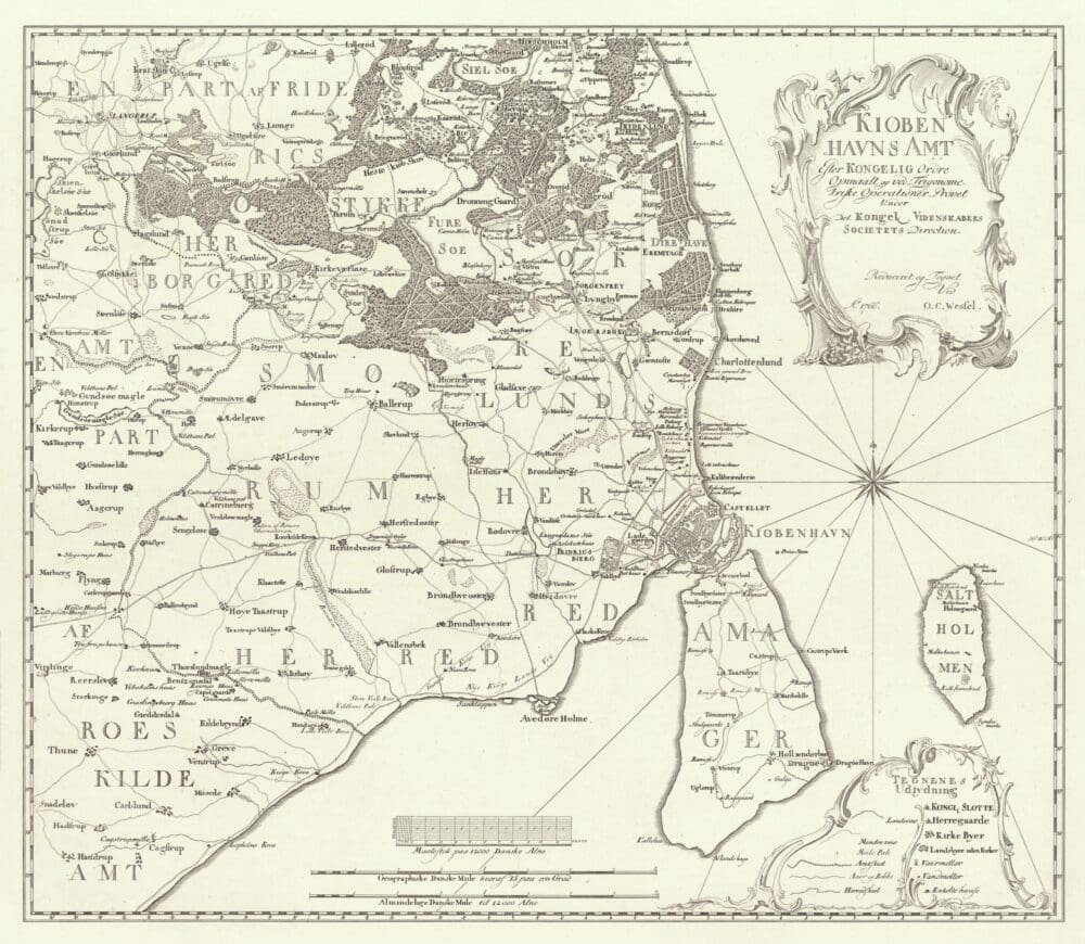Digitaliseret og tilgængeligt via historiskekort.dk. Versionen her er grafisk bearbejdet af Jespersen Tryk for Videnskabernes Selskab.